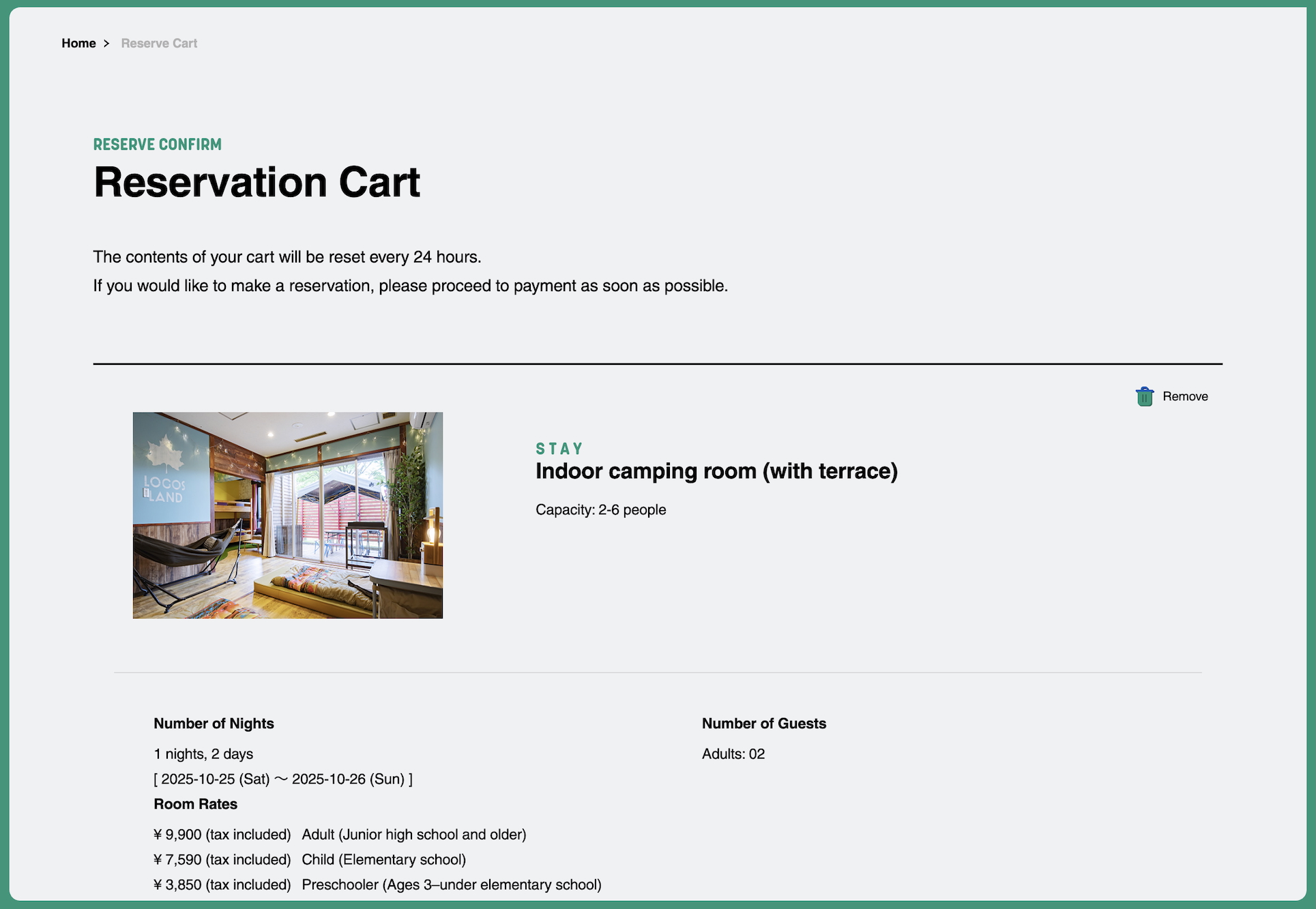 You can have up to one hotel reservation and multiple BBQ reservations in your cart, so we recommend booking them all at once!