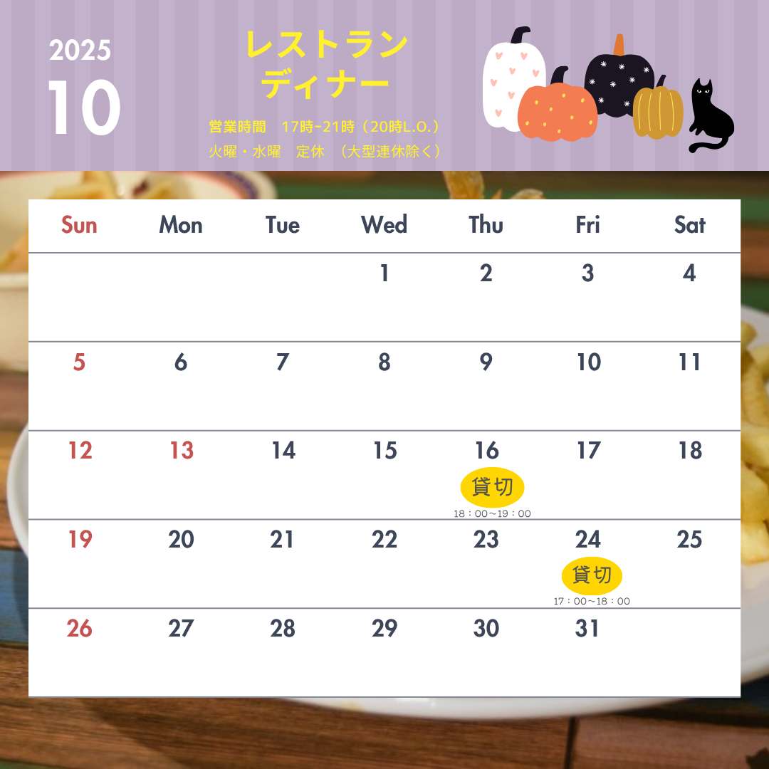 新着記事 レストラン利用不可日時に関しまして 2025.10.14 日頃よりロゴスランドをご愛顧いただき、誠にありがとうございます。レストランご利用不可日時についてのご案内です。*火曜、水曜は、ディナーは定休です。お客様には、大変ご迷惑をお掛けいたしますがご理解、ご協力のほど宜しくお願い申し上げます。*貸切日程は随時変更になる可能性がございますので、ご利用前にご確認下さい。*2025.11月以降の予定を確認したい場合は、プラムイン城陽にお問合せください。(TEL:0774-58-0010)